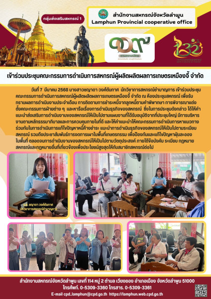 วันที่ 7 มีนาคม 2568 นางสาวชญาดา วงศ์ตันกาศ นักวิชาการสหกรณ์ชำนาญการ เข้าร่วมประชุมคณะกรรมการดำเนินการ สหกรณ์ผู้ผลิตผลิตผลการเกษตรเหมืองจี้ จำกัด ณ ห้องประชุมสหกรณ์ เพื่อรับทราบผลการดำเนินงานประจำเดือน การติดตามการชำระหนี้จากลูกหนี้ตามคำพิพากษา การพิจารณาแต่งตั้งคณะกรรมการฝ่ายต่าง ๆ และหารือเรื่องการดำเนินธุรกิจของสหกรณ์ ซึ่งในการประชุมดังกล่าว ได้ให้คำแนะนำส่งเสริมการดำเนินงานของสหกรณ์ให้เป็นไปตามแผนงานที่ได้รับอนุมัติจากที่ประชุมใหญ่ มีการบริหารงานตามหลักธรรมาภิบาลและการควบคุมภายในที่ดี และให้คำแนะนำให้คณะกรรมการดำเนินการหาแนวทางร่วมกันในการดำเนินการแก้ไขปัญหาหนี้ค้างชำระ แนะนำการดำเนินธุรกิจของสหกรณ์ให้เป็นไปตามระเบียบสหกรณ์ รวมถึงประชาสัมพันธ์การงดการเผาในพื้นที่เกษตรกรรม เพื่อป้องกันและแก้ไขปัญหาฝุ่นละอองในพื้นที่ ตลอดจนการดำเนินงานของสหกรณ์ให้เป็นไปตามวัตถุประสงค์ ภายใต้ข้อบังคับ ระเบียบ กฎหมายสหกรณ์และกฎหมายอื่นที่เกี่ยวข้องเพื่อประโยชน์สูงสุดให้กับสมาชิกสหกรณ์ต่อไป