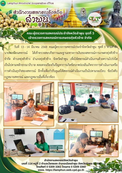 วันที่ 13 - 14 มีนาคม 2568 คณะผู้ตรวจการสหกรณ์ประจำจังหวัดลำพูน ชุดที่ 3 ตามคำสั่งนายทะเบียนสหกรณ์ ได้เข้าตรวจสอบกิจการและฐานะทางการเงินของสหกรณ์การเกษตรทุ่งหัวช้าง จำกัด ตำบลทุ่งหัวช้าง อำเภอทุ่งหัวช้าง จังหวัดลำพูน เพื่อให้สหกรณ์ดำเนินงานด้วยความโปร่งใส เป็นไปตามหลักธรรมาภิบาล ตลอดจนป้องกันปัญหาการเกิดข้อบกพร่องอันเกิดจากการดำเนินงานหรือการดำเนินธุรกิจของสหกรณ์ อีกทั้งเพื่อกำกับดูแลให้สหกรณ์ดำเนินงานเป็นไปตามระเบียบ ข้อบังคับ กฎหมายสหกรณ์ และกฎหมายอื่นที่เกี่ยวข้อง