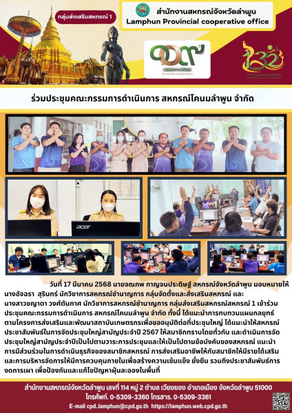 วันที่ 17 มีนาคม 2568 นายจณภพ กาญจนประดิษฐ์ สหกรณ์จังหวัดลำพูน มอบหมายให้ นางอัจฉรา สุรินทร์ นักวิชาการสหกรณ์ชำนาญการ กลุ่มจัดตั้งและส่งเสริมสหกรณ์ และนางสาวชญาดา วงศ์ตันกาศ นักวิชาการสหกรณ์ชำนาญการ กลุ่มส่งเสริมสหกรณ์สหกรณ์ 1 เข้าร่วมประชุมคณะกรรมการดำเนินการ สหกรณ์โคนมลำพูน จำกัด ทั้งนี้ ได้แนะนำการทบทวนแผนกลยุทธ์ตามโครงการส่งเสริมและพัฒนาสถาบันเกษตรกรเพื่อขออนุมัติต่อที่ประชุมใหญ่ ได้แนะนำให้สหกรณ์ประชาสัมพันธ์ในการจัดประชุมใหญ่สามัญประจำปี 2567 ให้สมาชิกทราบโดยทั่วกัน และดำเนินการจัดประชุมใหญ่สามัญประจำปีเป็นไปตามวาระการประชุมและให้เป็นไปตามข้อบังคับของสหกรณ์ แนะนำการมีส่วนร่วมในการดำเนินธุรกิจของสมาชิกสหกรณ์ การส่งเสริมอาชีพให้กับสมาชิกให้มีรายได้เสริม และการบริหารจัดการให้มีการควบคุมภายในเพื่อสร้างความเข้มแข็ง ยั่งยืน รวมถึงประชาสัมพันธ์การ
