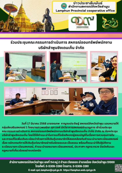 วันที่ 17 มีนาคม 2568 นายจณภพ กาญจนประดิษฐ์ สหกรณ์จังหวัดลำพูน มอบหมายให้ กลุ่มส่งเสริมสหกรณ์ 1 โดยนางสาวพรณิชา สุภาวงค์ นักวิชาการสหกรณ์ชำนาญการ เข้าร่วมประชุมคณะกรรมการดำเนินการ สหกรณ์ออมทรัพย์พนักงานบริษัทลำพูนซิงเดนเก็น จำกัด จำกัด ณ ห้องประชุมบริษัทลำพูนซิงเดนเก็น โดยได้ให้คำแนะนำในการแก้ไขข้อสังเกตผู้สอบบัญชีในเรื่องการควบคุมภายใน และการแก้ไขเพิ่มเติมระเบียบว่าด้วยการให้เงินกู้แกสมาชิกให้สอดคล้องกับคำแนะนำนายทะเบียนสหกรณ์ เรื่อง หลักเกณฑ์การให้เงินกู้แก่สมาชิกอย่างรับผิดชอบและเป็นธรรม พร้อมทั้งแนะนำให้ปฏิบัติตามระเบียบนายทะเบียนสหกรณ์, คำแนะนำของนายทะเบียนสหกรณ์, ประกาศฯ กฎกระทรวง ข้อบังคับและกฎหมายที่เกี่ยวข้องอย่างเคร่งครัด