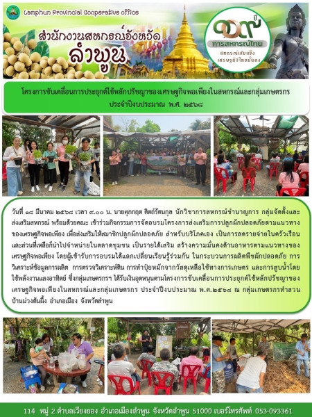 วันที่ 18 มีนาคม 2568 เวลา 9.00 น. นายศุภกฤต ดิตถ์รัตนกุล นักวิชาการสหกรณ์ชำนาญการ กลุ่มจัดตั้งและส่งเสริมสหกรณ์ พร้อมด้วยคณะ เข้าร่วมกิจกรรมการจัดอบรมโครงการส่งเสริมการปลูกผักปลอดภัยตามแนวทางของเศรษฐกิจพอเพียง เพื่อส่งเสริมให้สมาชิกปลูกผักปลอดภัย สำหรับบริโภคเอง เป็นการลดรายจ่ายในครัวเรือน และส่วนที่เหลือก็นำไปจำหน่ายในตลาดชุมชน เป็นรายได้เสริม สร้างความมั่นคงด้านอาหารตามแนวทางของเศรษฐกิจพอเพียง โดยผู้เข้ารับการอบรมได้แลกเปลี่ยนเรียนรู้ร่วมกัน ในกระบวนการผลิตพืชผักปลอดภัย การวิเคราะห์ข้อมูลการผลิต การตรวจวิเคราะห์ดิน การทำปุ๋ยหมักจากวัสดุเหลือใช้ทางการเกษตร และการสูบน้ำโดยใช้พลังงานแสงอาทิตย์ ซึ่งกลุ่มเกษตรกรฯ ได้รับเงินอุดหนุนตามโครงการขับเคลื่อนการประยุกต์ใช้หลักปรัชญาของเศรษฐกิจพอเพียงในสหกรณ์และกลุ่มเกษตรกร ประจำปีงบประมาณ พ.ศ.2568 ณ กลุ่มเกษตรกรทำสวนบ้านม่วงต้นผึ้ง อำเภอเมือง จังหวัดลำพูน
