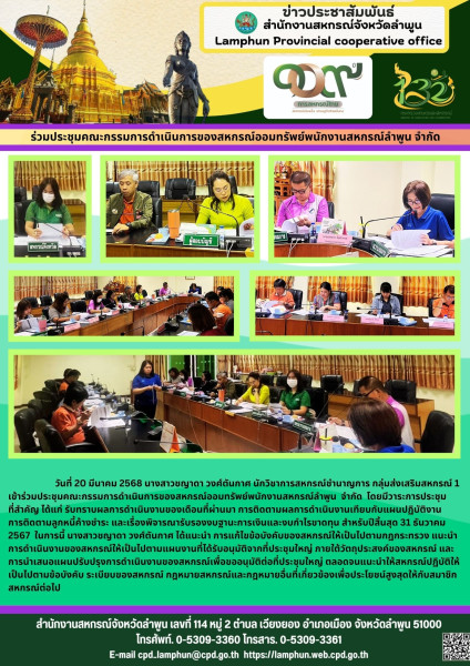 วันที่ 20 มีนาคม 2568 นางสาวชญาดา วงศ์ตันกาศ นักวิชาการสหกรณ์ชำนาญการ กลุ่มส่งเสริมสหกรณ์ 1 เข้าร่วมประชุมคณะกรรมการดำเนินการของสหกรณ์ออมทรัพย์พนักงานสหกรณ์ลำพูน จำกัด โดยมีวาระการประชุมที่สำคัญ ได้แก่ รับทราบผลการดำเนินงานของเดือนที่ผ่านมา การติดตามผลการดำเนินงานเทียบกับแผนปฏิบัติงานการติดตามลูกหนี้ค้างชำระ และเรื่องพิจารณารับรองงบฐานะการเงินและงบกำไรขาดทุน สำหรับปีสิ้นสุด 31 ธันวาคม 2567 ในการนี้ นางสาวชญาดา วงศ์ตันกาศ ได้แนะนำ การแก้ไขข้อบังคับของสหกรณ์ให้เป็นไปตามกฎกระทรวง แนะนำการดำเนินงานของสหกรณ์ให้เป็นไปตามแผนงานที่ได้รับอนุมัติจากที่ประชุมใหญ่ ภายใต้วัตถุประสงค์ของสหกรณ์ และการนำเสนอแผนปรับปรุงการดำเนินงานของสหกรณ์เพื่อขออนุมัติต่อที่ประชุมใหญ่ ตลอดจนแนะนำให้สหกรณ์ปฏิบัติให้เป็นไปตามข้อบังคับ ระเบียบของสหกรณ์ กฎหมายสหกรณ์และกฎหมายอื่นที่เกี่ยวข้องเพื่อประโยชน์สูงสุดให้กับสมาชิกสหกรณ์ต่อไป