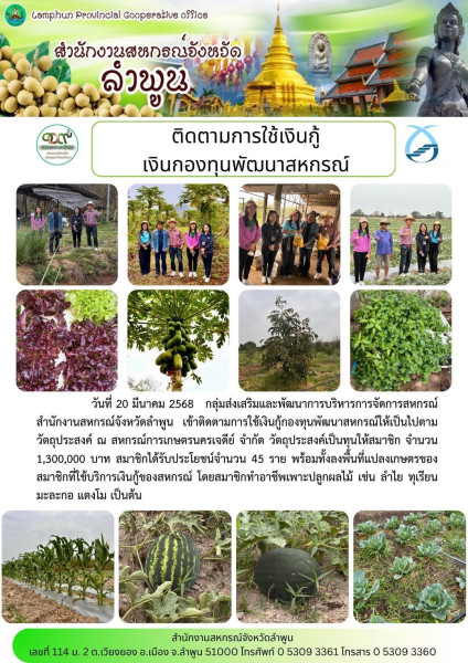 วันที่ 20 มีนาคม 2568 กลุ่มส่งเสริมและพัฒนาการบริหารการจัดการสหกรณ์ สำนักงานสหกรณ์จังหวัดลำพูน เข้าติดตามการใช้เงินกู้กองทุนพัฒนาสหกรณ์ให้เป็นไปตามวัตถุประสงค์ ณ สหกรณ์การเกษตรนครเจดีย์ จำกัด วัตถุประสงค์เป็นทุนให้สมาชิก จำนวน 1,300,000 บาท สมาชิกได้รับประโยชน์จำนวน 45 ราย พร้อมทั้งลงพื้นที่แปลงเกษตรของสมาชิกที่ใช้บริการเงินกู้ของสหกรณ์ โดยสมาชิกทำอาชีพเพาะปลูกผลไม้ เช่น ลำไย ทุเรียน มะละกอ แตงโม เป็นต้น
