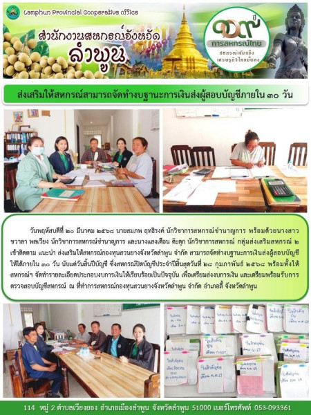 วันที่ 20 มีนาคม 2568 นายสมภพ ฤทธิรงค์ นักวิชาการสหกรณ์ชำนาญการ พร้อมด้วยนางสาวชวาลา พลเวียง นักวิชาการสหกรณ์ชำนาญการ และนางแสงเดือน ต๊ะดุก นักวิชาการสหกรณ์ กลุ่มส่งเสริมสหกรณ์ 2 เข้าติดตาม แนะนำ ส่งเสริมให้สหกรณ์กองทุนสวนยางจังหวัดลำพูน จำกัด สามารถจัดทำงบฐานะการเงินส่งผู้สอบบัญชีให้ได้ภายใน 30 วัน นับแต่วันสิ้นปีบัญชี ซึ่งสหกรณ์ปิดบัญชีประจำปีสิ้นสุดวันที่ 28 กุมภาพันธ์ 2568 พร้อมทั้งให้สหกรณ์ฯ จัดทำรายละเอียดประกอบงบการเงินให้เรียบร้อยเป็นปัจจุบัน เพื่อเตรียมส่งงบการเงิน และเตรียมพร้อมรับการตรวจสอบบัญชีสหกรณ์ ณ ที่ทำการสหกรณ์กองทุนสวนยางจังหวัดลำพูน จำกัด อำเภอลี้ จังหวัดลำพูน