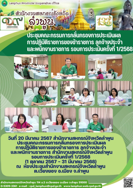 ประชุมคณะกรรมการกลั่นกรองการประเมินผลการปฏิบัติราชการของข้าราชการ FACEBOOK TWITTER LINE วันที่ 20 มีนาคม 2567 สำนักงานสหกรณ์จังหวัดลำพูน ประชุมคณะกรรมการกลั่นกรองการประเมินผลการปฏิบัติราชการของข้าราชการ ลูกจ้างประจำและพนักงานราชการ สำนักงานสหกรณ์จังหวัดลำพูน รอบการประเมินครั้งที่ 1/2568 (1 ตุลาคม 2567 – 31 มีนาคม 2568) ณ ห้องประชุมสำนักงานสหกรณ์จังหวัดลำพูน ต.เวียงยอง อ.เมือง จ.ลำพูน