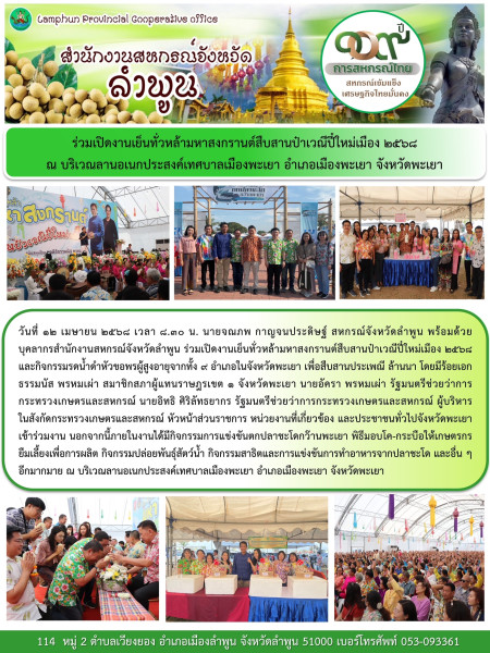 วันที่ 12 เมษายน 2568 เวลา 8.30 น. นายจณภพ กาญจนประดิษฐ์ สหกรณ์จังหวัดลำพูน พร้อมด้วยบุคลากรสำนักงานสหกรณ์จังหวัดลำพูน ร่วมเปิดงานเย็นทั่วหล้ามหาสงกรานต์สืบสานป๋าเวณีปี๋ใหม่เมือง 2568 และกิจกรรมรดน้ำดำหัวขอพรผู้สูงอายุจากทั้ง 9 อำเภอในจังหวัดพะเยา เพื่อสืบสานประเพณี ล้านนา โดยมีร้อยเอกธรรมนัส พรหมเผ่า สมาชิกสภาผู้แทนราษฎรเขต 1 จังหวัดพะเยา นายอัครา พรหมเผ่า รัฐมนตรีช่วยว่าการกระทรวงเกษตรและสหกรณ์ นายอิทธิ ศิริลัทธยากร รัฐมนตรีช่วยว่าการกระทรวงเกษตรและสหกรณ์ ผู้บริหารในสังกัดกระทรวงเกษตรและสหกรณ์ หัวหน้าส่วนราชการ หน่วยงานที่เกี่ยวข้อง และประชาชนทั่วไปจังหวัดพะเยา เข้าร่วมงาน นอกจากนี้ภายในงานได้มีกิจกรรมการแข่งขันตกปลาชะโดกว๊านพะเยา พิธีมอบโค-กระบือให้เกษตรกร ยืมเลี้ยงเพื่อการผลิต กิจกรรมปล่อยพันธุ์สัตว์น้ำ กิจกรรมสาธิตและการแข่งขันการทำอาหารจากปลาชะโด และอื่น ๆ อีกมากมาย ณ บริเวณลานอเนกประสงค์เทศบาลเมืองพะเยา อำเภอเมืองพะเยา จังหวัดพะเยา
