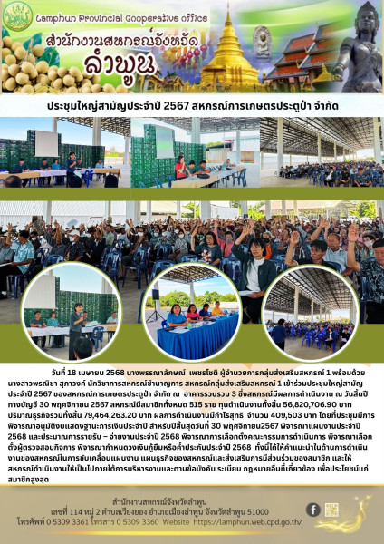 วันที่ 18 เมษายน 2568 นางพรรณาลักษณ์ เพชรโชติ ผู้อำนวยการกลุ่มส่งเสริมสหกรณ์ 1 พร้อมด้วยนางสาวพรณิชา สุภาวงค์ นักวิชาการสหกรณ์ชำนาญการ สหกรณ์กลุ่มส่งเสริมสหกรณ์ 1 เข้าร่วมประชุมใหญ่สามัญประจำปี 2567 ของสหกรณ์การเกษตรประตูป่า จำกัด ณ อาคารรวบรวม 3 ซึ่งสหกรณ์มีผลการดำเนินงาน ณ วันสิ้นปีทางบัญชี 30 พฤศจิกายน 2567 สหกรณ์มีสมาชิกทั้งหมด 515 ราย ทุนดำเนินงานทั้งสิ้น 56,820,706.90 บาท ปริมาณธุรกิจรวมทั้งสิ้น 79,464,263.20 บาท ผลการดำเนินงานมีกำไรสุทธิ จำนวน 409,503 บาท โดยที่ประชุมมีการพิจารณาอนุมัติงบแสดงฐานะการเงินประจำปี สำหรับปีสิ้นสุดวันที่ 30 พฤศจิกายน2567 พิจารณาแผนงานประจำปี 2568 และประมาณการรายรับ – จ่ายงานประจำปี 2568 พิจารณาการเลือกตั้งคณะกรรมการดำเนินการ พิจารณาเลือกตั้งผู้ตรวจสอบกิจการ พิจารณากำหนดวงเงินกู้ยืมหรือค้ำประกันประจำปี 2568 ทั้งนี้ได้ให้คำแนะนำในด้านการดำเนินงานของสหกรณ์ในการขับเคลื่อนแผนงาน แผนธุรกิจของสหกรณ์และส่งเสริมการมีส่วนร่วมของสมาชิก และให้สหกรณ์ดำเนินงานให้เป็นไปภายใต้การบริหารงานและตามข้อบังคับ ระเบียบ กฎหมายอื่นที่เกี่ยวข้อง เพื่อประโยชน์แก่สมาชิกสูงสุด