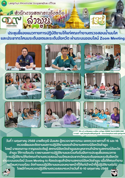 วันที่ 1 พฤษภาคม 2568 นายคีตวุฒิ นับแสง ผู้ตรวจราชการกรม เขตตรวจราชการที่ 15 และ 16 ตรวจเยี่ยมและติดตามผลการปฏิบัติงานของสำนักงานสหกรณ์จังหวัดลำพูน โดยมี นายจณภาพ กาญจนประดิษฐ์ สหกรณ์จังหวัดลำพูนและบุคลากรสำนักงานสหกรณ์จังหวัดลำพูน ให้การต้อนรับ รายงานผลการปฏิบัติงานและร่วมกันรับฟังการประชุมชี้แจงแนวทางการปฏิบัติงานให้แก่คณะทำงานตรวจสอบน้ำนมโคและประชากรโคนมระดับเขตและระดับจังหวัด ผ่านระบบออนไลน์ Zoom Meeting ณ ห้องประชุมสำนักงานสหกรณ์จังหวัดลำพูน เพื่อให้คณะทำงานเตรียมความพร้อม จัดทำแผนปฏิบัติงานและมอบหมายหน้าที่ให้แก่เจ้าหน้าที่ผู้ปฏิบัติงานต่อไป โดยมีกำหนดเวลาปฏิบัติงานตรวจสอบฯระหว่างวันที่ 6-10 พฤษภาคม 2568