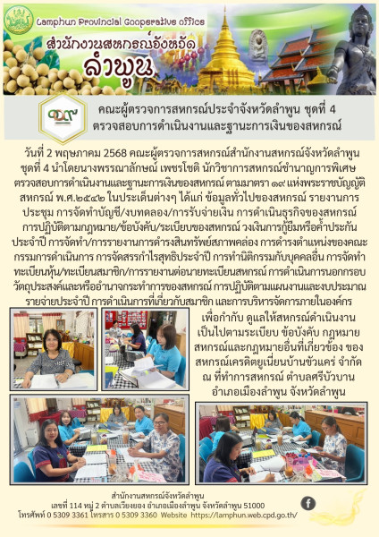 วันที่ 2 พฤษภาคม 2568 คณะผู้ตรวจการสหกรณ์สำนักงานสหกรณ์จังหวัดลำพูน ชุดที่ 4 นำโดยนางพรรณาลักษณ์ เพชรโชติ นักวิชาการสหกรณ์ชำนาญการพิเศษ ตรวจสอบการดำเนินงานและฐานะการเงินของสหกรณ์ ตามมาตรา ๑๙ แห่งพระราชบัญญัติสหกรณ์ พ.ศ.๒๕๔๒ ในประเด็นต่างๆ ได้แก่ ข้อมูลทั่วไปของสหกรณ์ รายงานการประชุม การจัดทำบัญชี/งบทดลอง/การรับจ่ายเงิน การดำเนินธุรกิจของสหกรณ์ การปฏิบัติตามกฎหมาย/ข้อบังคับ/ระเบียบของสหกรณ์ วงเงินการกู้ยืมหรือค้ำประกันประจำปี การจัดทำ/การรายงานการดำรงสินทรัพย์สภาพคล่อง การดำรงตำแหน่งของคณะกรรมการดำเนินการ การจัดสรรกำไรสุทธิประจำปี การทำนิติกรรมกับบุคคลอื่น การจัดทำทะเบียนหุ้น/ทะเบียนสมาชิก /การรายงานต่อนายทะเบียนสหกรณ์ การดำเนินการนอกกรอบวัตถุประสงค์และหรืออำนาจกระทำการของสหกรณ์ การปฏิบัติตามแผนงานและงบประมาณรายจ่ายประจำปี การดำเนินการที่เกี่ยวกับสมาชิก และการบริหารจัดการภายในองค์กร เพื่อกำกับ ดูแลให้สหกรณ์ดำเนินงานเป็นไปตามระเบียบ ข้อบังคับ กฎหมายสหกรณ์และกฎหมายอื่นที่เกี่ยวข้อง ของสหกรณ์เครดิตยูเนี่ยนบ้านขัวแคร่ จำกัด ณ ที่ทำการสหกรณ์ ตำบลศรีบัวบาน อำเภอเมืองลำพูน จังหวัดลำพูน