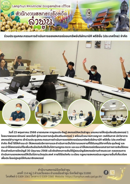 วันที่ 23 พฤษภาคม 2568 นายจณภพ กาญจนประดิษฐ์ สหกรณ์จังหวัดลำพูน มอบหมายให้กลุ่มส่งเสริมสหกรณ์ 1 โดยนางพรรณาลักษณ์ เพชรโชติ ผู้อำนวยการกลุ่มส่งเสริมสหกรณ์ 1 พร้อมด้วยนางสาวชญาดา วงศ์ตันกาศ นักวิชาการสหกรณ์ชำนาญการ เข้าร่วมประชุมคณะกรรมการดำเนินการของสหกรณ์ออมทรัพย์บริษัทนามิกิ พรีซิชั่น (ประเทศไทย) จำกัด ทั้งนี้ ได้ให้คำแนะนำ ให้สหกรณ์บริหารงานและดำเนินการเป็นไปตามแผนงานที่ได้รับอนุมัติจากที่ประชุมใหญ่ และแนะนำให้สหกรณ์แก้ไขเพิ่มเติมข้อบังคับให้เป็นไปตามกฎกระทรวง และแนะนำให้สหกรณ์ตรียมเอกสารทางการเงินให้ครบถ้วนสำหรับการปิดบัญชี 30 มิถุนายน 2568 แล้วจัดส่งงบการเงินให้ผู้สอบบัญชีสหกรณ์ตามกำหนดเวลา ตลอดจนการดำเนินงานของสหกรณ์ให้เป็นไปตามวัตถุประสงค์ ภายใต้ข้อบังคับ ระเบียบ กฎหมายสหกรณ์และกฎหมายอื่นที่เกี่ยวข้องเพื่อประโยชน์สูงสุดให้กับสมาชิกสหกรณ์