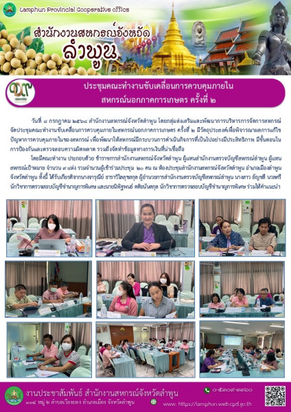 วันที่ 8 กรกฎาคม 2568 สำนักงานสหกรณ์จังหวัดลำพูน โดยกลุ่มส่งเสริมและพัฒนาการบริหารการจัดการสหกรณ์ จัดประชุมคณะทำงานขับเคลื่อนการควบคุมภายในสหกรณ์นอกภาคการเกษตร ครั้งที่ 2 มีวัตถุประสงค์เพื่อพิจารณาผลการแก้ไขปัญหาการควบคุมภายในของสหกรณ์ เพื่อพัฒนาให้สหกรณ์มีกระบวนการดำเนินกิจการที่เป็นไปอย่างมีประสิทธิภาพ มีขั้นตอนในการป้องกันและตรวจสอบความผิดพลาด รวมถึงจัดทำข้อมูลทางการเงินที่น่าเชื่อถือ โดยมีคณะทำงาน ประกอบด้วย ข้าราชการสำนักงานสหกรณ์จังหวัดลำพูน ผู้แทนสำนักงานตรวจบัญชีสหกรณ์ลำพูน ผู้แทนสหกรณ์เป้าหมาย จำนวน 9 แห่ง รวมจำนวนผู้เข้าร่วมประชุม 20 คน ณ ห้องประชุมสำนักงานสหกรณ์จังหวัดลำพูน อำเภอเมืองลำพูน จังหวัดลำพูน ทั้งนี้ ได้รับเกียรติจากนางจารุณีย์ ธาราวิไลสุขสกุล ผู้อำนวยการสำนักงานตรวจบัญชีสหกรณ์ลำพูน นางสาว อัญชลี นวลศรี นักวิชาการตรวจสอบบัญชีชำนาญการพิเศษ และนายนิพิฐพนธ์ ตติยนันตกุล นักวิชาการตรวจสอบบัญชีชำนาญการพิเศษ ร่วมให้คำแนะนำ