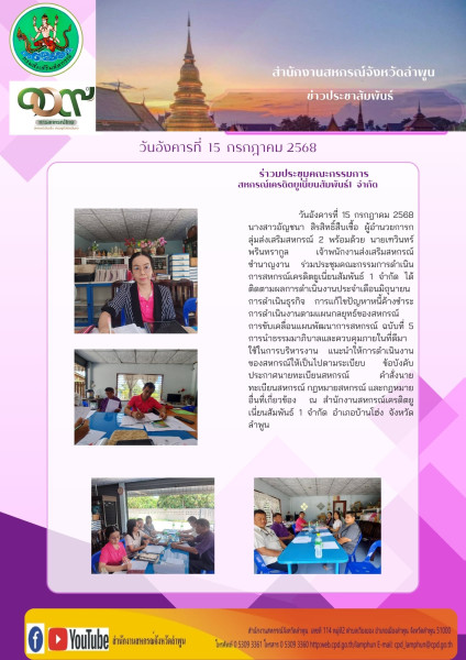 วันที่ 15 กรกฎาคม 2568 นางสาวอัญชนา สิรสิทธิ์สืบเชื้อ ผู้อำนวยการกลุ่มส่งเสริมสหกรณ์ 2 พร้อมด้วย นายเฑวินทร์ พรินทรากูล เจ้าพนักงานส่งเสริมสหกรณ์ชำนาญงาน ร่วมประชุมคณะกรรมการดำเนินการสหกรณ์เครดิตยูเนี่ยนสัมพันธ์ 1 จำกัด ได้ติดตามผลการดำเนินงานประจำเดือนมิถุนายน การดำเนินธุรกิจ การแก้ไขปัญหาหนี้ค้างชำระ การดำเนินงานตามแผนกลยุทธ์ของสหกรณ์ การขับเคลื่อนแผนพัฒนาการสหกรณ์ ฉบับที่ 5 การนำธรรมมาภิบาลและควบคุมภายในที่ดีมาใช้ในการบริหารงาน แนะนำให้การดำเนินงานของสหกรณ์ให้เป็นไปตามระเบียบ ข้อบังคับ ประกาศนายทะเบียนสหกรณ์ คำสั่งนายทะเบียนสหกรณ์ กฏหมายสหกรณ์ และกฏหมายอื่นที่เกี่ยวข้อง ณ สำนักงานสหกรณ์เครดิตยูเนี่ยนสัมพันธ์ 1 จำกัด อำเภอบ้านโฮ่ง จังหวัดลำพูน