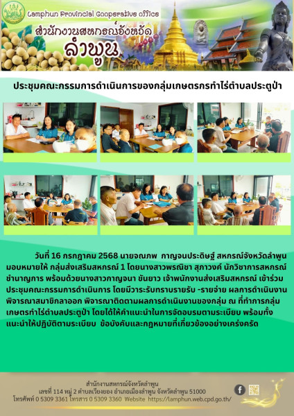 วันที่ 16 กรกฎาคม 2568 นายจณภพ กาญจนประดิษฐ์ สหกรณ์จังหวัดลำพูน มอบหมายให้ กลุ่มส่งเสริมสหกรณ์ 1 โดยนางสาวพรณิชา สุภาวงค์ นักวิชาการสหกรณ์ชำนาญการ พร้อมด้วยนางสาวกาญจนา ขันยาว เจ้าพนักงานส่งเสริมสหกรณ์ เข้าร่วมประชุมคณะกรรมการดำเนินการ โดยมีวาระรับทราบรายรับ -รายจ่าย ผลการดำเนินงาน พิจารณาสมาขิกลาออก พิจารณาติดตามผลการดำเนินงานของกลุ่ม ณ ที่ทำการกลุ่มเกษตรทำไร่ตำบลประตูป่า โดยได้ให้คำแนะนำในการจัดอบรมตามระเบียบ พร้อมทั้งแนะนำให้ปฏิบัติตามระเบียบ ข้อบังคับและกฎหมายที่เกี่ยวข้องอย่างเคร่งครัด