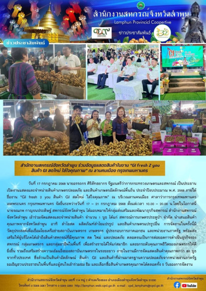 โดยในโอกาสนี้ นายจณภพ กาญจนประดิษฐ์ สหกรณ์จังหวัดลำพูน ได้มอบหมายให้กลุ่มส่งเสริมและพัฒนาธุรกิจสหกรณ์ สำนักงานสหกรณ์จังหวัดลำพูน เข้าร่วมจัดแสดงและจำหน่ายสินค้า จำนวน 1 บูธ ได้แก่ สหกรณ์การเกษตรประตูป่า จำกัด นำเสนอสินค้าคุณภาพจากจังหวัดลำพูน อาทิ ลำไยสด ผลิตภัณฑ์ลำไยแปรรูป และสินค้าเกษตรแปรรูปอื่น ๆ