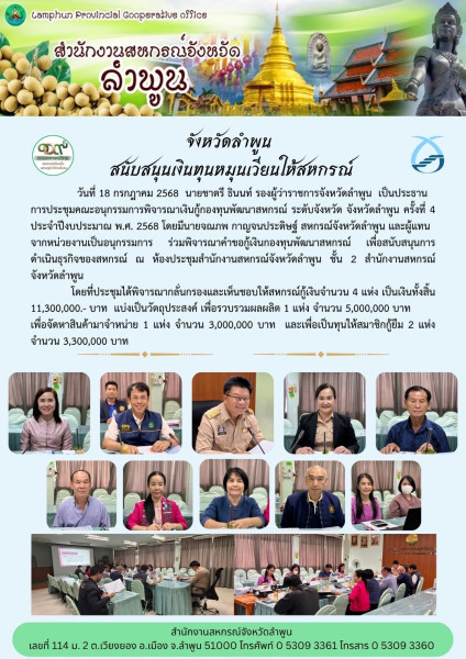 วันที่ 18 กรกฎาคม 2568 นายชาตรี ธินนท์ รองผู้ว่าราชการจังหวัดลำพูน เป็นประธาน การประชุมคณะอนุกรรมการพิจารณาเงินกู้กองทุนพัฒนาสหกรณ์ ระดับจังหวัด จังหวัดลำพูน ครั้งที่ 4 ประจำปีงบประมาณ พ.ศ. 2568 โดยมีนายจณภพ กาญจนประดิษฐ์ สหกรณ์จังหวัดลำพูน และผู้แทนจากหน่วยงานเป็นอนุกรรมการ ร่วมพิจารณาคำขอกู้เงินกองทุนพัฒนาสหกรณ์ เพื่อสนับสนุนการดำเนินธุรกิจของสหกรณ์ ณ ห้องประชุมสำนักงานสหกรณ์จังหวัดลำพูน ชั้น 2 สำนักงานสหกรณ์จังหวัดลำพูน โดยที่ประชุมได้พิจารณากลั่นกรองและเห็นชอบให้สหกรณ์กู้เงินจำนวน 4 แห่ง เป็นเงินทั้งสิ้น 11,300,000.- บาท แบ่งเป็นวัตถุประสงค์ เพื่อรวบรวมผลผลิต 1 แห่ง จำนวน 5,000,000 บาท เพื่อจัดหาสินค้ามาจำหน่าย 1 แห่ง จำนวน 3,000,000 บาท และเพื่อเป็นทุนให้สมาชิกกู้ยืม 2 แห่ง จำนวน 3,300,000 บาท