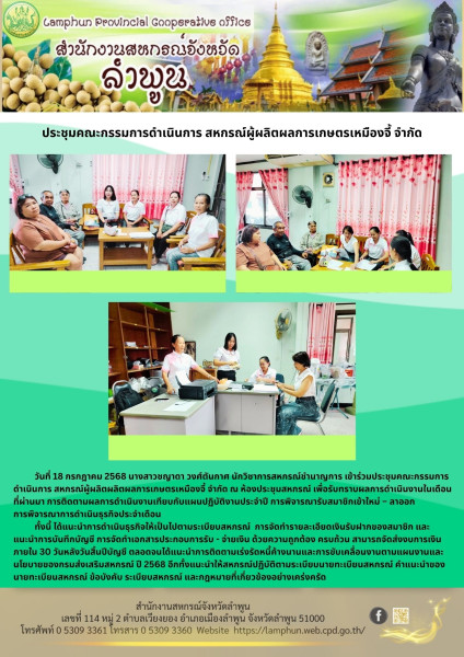 วันที่ 18 กรกฎาคม 2568 นางสาวชญาดา วงศ์ตันกาศ นักวิชาการสหกรณ์ชำนาญการ เข้าร่วมประชุมคณะกรรมการดำเนินการ สหกรณ์ผู้ผลิตผลิตผลการเกษตรเหมืองจี้ จำกัด ณ ห้องประชุมสหกรณ์ เพื่อรับทราบผลการดำเนินงานในเดือนที่ผ่านมา การติดตามผลการดำเนินงานเทียบกับแผนปฏิบัติงานประจำปี การพิจารณารับสมาชิกเข้าใหม่ – ลาออก การพิจารณาการดำเนินธุรกิจประจำเดือน ทั้งนี้ ได้แนะนำการดำเนินธุรกิจให้เป็นไปตามระเบียบสหกรณ์ การจัดทำรายละเอียดเงินรับฝากของสมาชิก และแนะนำการบันทึกบัญชี การจัดทำเอกสารประกอบการรับ - จ่ายเงิน ด้วยความถูกต้อง ครบถ้วน สามารถจัดส่งงบการเงินภายใน 30 วันหลังวันสิ้นปีบัญชี ตลอดจนได้แนะนำการติดตามเร่งรัดหนี้ค้างนานและการขับเคลื่อนงานตามแผนงานและนโยบายของกรมส่งเสริมสหกรณ์ ปี 2568 อีกทั้งแนะนำให้สหกรณ์ปฏิบัติตามระเบียบนายทะเบียนสหกรณ์ คำแนะนำของนายทะเบียนสหกรณ์ ข้อบังคับ ระเบียบสหกรณ์ และกฎหมายที่เกี่ยวข้องอย่างเคร่งครัด