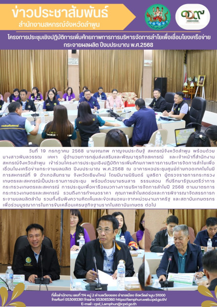 วันที่ 19 กรกฎาคม 2568 นายจณภพ กาญจนประดิษฐ์ สหกรณ์จังหวัดลำพูน พร้อมด้วยนางสาวพิมลวรรณ เคหา ผู้อำนวยการกลุ่มส่งเสริมและพัฒนาธุรกิจสหกรณ์ และเจ้าหน้าที่สำนักงานสหกรณ์จังหวัดลำพูน เข้าร่วมโครงการประชุมเชิงปฏิบัติการเพิ่มศักยภาพการการบริหารจัดการลำไยเพื่อเชื่อมโยงเครือข่ายกระจายผลผลิต ปีงบประมาณ พ.ศ.2568 ณ อาคารหอประชุมศูนย์ถ่ายทอดเทคโยโนยีการสหกรณ์ที่ 9 อำเภอสันทราย จังหวัดเชียงใหม่ โดยมีนายนิรันดร์ มูลธิดา ผู้ตรวจราชการกระทรวงเกษตรและสหกรณ์เป็นประธานการประชุม พร้อมด้วยนายธนสาร ธรรมสอน ที่ปรึกษารัฐมนตรีว่าการกระทรวงเกษตรและสหกรณ์ การประชุมเพื่อหารือแนวทางการบริหารจัดการลำไยปี 2568 ตามมาตรการกระทรวงเกษตรและสหกรณ์ รวมถึงการกำหนดราคา คุณภาพลำไยสดช่อและการพิจารณาจัดสรรการกระจายผลผลิตลำไย รวมทั้งรับฟังความคิดเห็นและข้อเสนอแนะจากหน่วยงานภาครัฐ และสถาบันเกษตรกร เพื่อร่วมบูรณาการในการขับเคลื่อนเศรษฐกิจฐานรากในสถาบันเกษตร ต่อไป