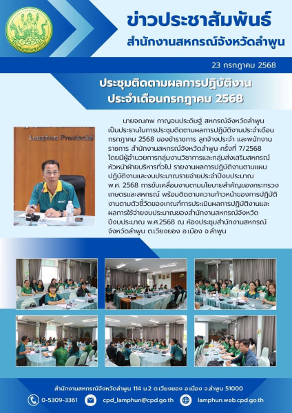 วันที่ 23 กรกฎาคม 2568 นายจณภพ กาญจนประดิษฐ์ สหกรณ์จังหวัดลำพูน เป็นประธานในการประชุมติดตามผลการปฏิบัติงานประจำเดือนกรกฎาคม 2568 ของข้าราชการ ลูกจ้างประจำ และพนักงานราชการ สำนักงานสหกรณ์จังหวัดลำพูน ครั้งที่ 7/2568 โดยมีผู้อำนวยการกลุ่มงานวิชาการและกลุ่มส่งเสริมสหกรณ์ หัวหน้าฝ่ายบริหารทั่วไป รายงานผลการปฏิบัติงานตามแผนปฏิบัติงานและงบประมาณรายจ่ายประจำปีงบประมาณ พ.ศ. 2568 การขับเคลื่อนงานตามนโยบายสำคัญของกระทรวงเกษตรและสหกรณ์ พร้อมติดตามความก้าวหน้าของการปฏิบัติงานตามตัวชี้วัดของเกณฑ์การประเมินผลการปฏิบัติงานและผลการใช้จ่ายงบประมาณของสำนักงานสหกรณ์จังหวัดปีงบประมาณ พ.ศ.2568 ณ ห้องประชุมสำนักงานสหกรณ์จังหวัดลำพูน ต.เวียงยอง อ.เมือง จ.ลำพูน