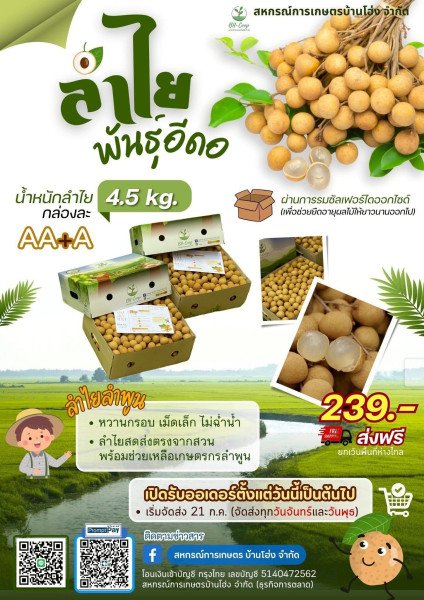 26 กรกฎาคม 2568 สำนักงานสหกรณ์จังหวัดลำพูน เดินหน้าสนับสนุนการดำเนินงานของสหกรณ์ ภาคการเกษตรในพื้นที่อย่างต่อเนื่อง ล่าสุดได้ร่วมส่งเสริมและสนับสนุนการจำหน่ายลำไยพันธุ์อีดอคุณภาพเยี่ยมจากสหกรณ์การเกษตรบ้านโฮ่ง จำกัด เพื่อยกระดับรายได้และสร้างความเข้มแข็งให้กับเกษตรกรสมาชิกในจังหวัดลำพูน ลำไยพันธุ์อีดอ จากสหกรณ์การเกษตรบ้านโฮ่ง จำกัด มีจุดเด่นคือ หวานกรอบ เม็ดเล็ก ไม่ฉ่ำน้ำ เป็นลำไยสดส่งตรงจากสวน บรรจุในกล่องขนาด 4.5 กิโลกรัม เกรด AA+ ผ่านกรรมวิธีการอบซัลเฟอร์ไดออกไซด์ เพื่อช่วยยืดอายุผลผลิตและคงความสดใหม่ ลำไย ดังกล่าวพร้อมจำหน่ายในราคาพิเศษเพียง 239 บาท พร้อมบริการจัดส่งฟรีทั่วประเทศไทย (ยกเว้นพื้นที่ห่างไกล) สหกรณ์การเกษตรบ้านโฮ่ง จำกัด เริ่มเปิดรับออเดอร์ตั้งแต่วันนี้เป็นต้นไป และจะเริ่มจัดส่งสินค้าทุกวันจันทร์และวันพุธ ผู้ที่สนใจสามารถสั่งซื้อหรือสอบถามรายละเอียดเพิ่มเติม ได้ที่:Facebook: สหกรณ์การเกษตรบ้านโฮ่ง จำกัด การสนับสนุนในครั้งนี้ เป็นส่วนหนึ่งของนโยบายของสำนักงานสหกรณ์จังหวัดลำพูน ในการผลักดันให้สหกรณ์เป็นกลไกสำคัญในการพัฒนาเศรษฐกิจฐานรากของประเทศ และสร้างประโยชน์สูงสุดแก่สมาชิกและชุมชน