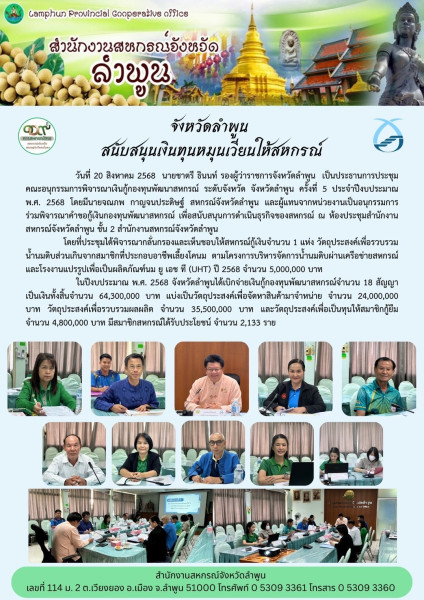 วันที่ 20 สิงหาคม 2568 นายชาตรี ธินนท์ รองผู้ว่าราชการจังหวัดลำพูน เป็นประธานการประชุมคณะอนุกรรมการพิจารณาเงินกู้กองทุนพัฒนาสหกรณ์ ระดับจังหวัด จังหวัดลำพูน ครั้งที่ 5 ประจำปีงบประมาณ พ.ศ. 2568 โดยมีนายจณภพ กาญจนประดิษฐ์ สหกรณ์จังหวัดลำพูน และผู้แทนจากหน่วยงานเป็นอนุกรรมการ ร่วมพิจารณาคำขอกู้เงินกองทุนพัฒนาสหกรณ์ เพื่อสนับสนุนการดำเนินธุรกิจของสหกรณ์ ณ ห้องประชุมสำนักงานสหกรณ์จังหวัดลำพูน ชั้น 2 สำนักงานสหกรณ์จังหวัดลำพูน โดยที่ประชุมได้พิจารณากลั่นกรองและเห็นชอบให้สหกรณ์กู้เงินจำนวน 1 แห่ง วัตถุประสงค์เพื่อรวบรวมน้ำนมดิบส่วนเกินจากสมาชิกที่ประกอบอาชีพเลี้ยงโคนม ตามโครงการบริหารจัดการน้ำนมดิบผ่านเครือข่ายสหกรณ์และโรงงานแปรรูปเพื่อเป็นผลิตภัณฑ์นม ยู เอช ที (UHT) ปี 2568 จำนวน 5,000,000 บาท ในปีงบประมาณ พ.ศ. 2568 จังหวัดลำพูนได้เบิกจ่ายเงินกู้กองทุนพัฒนาสหกรณ์จำนวน 18 สัญญา เป็นเงินทั้งสิ้นจำนวน 64,300,000 บาท แบ่งเป็นวัตถุประสงค์เพื่อจัดหาสินค้ามาจำหน่าย จำนวน 24,000,000 บาท วัตถุประสงค์เพื่อรวบรวมผลผลิต จำนวน 35,500,000 บาท และวัตถุประสงค์เพื่อเป็นทุนให้สมาชิกกู้ยืม จำนวน 4,800,000 บาท มีสมาชิกสหกรณ์ได้รับประโยชน์ จำนวน 2,133 ราย