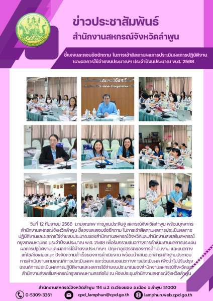 วันที่ 12 กันยายน 2568 นายจณภพ กาญจนประดิษฐ์ สหกรณ์จังหวัดลำพูน พร้อมบุคลากรสำนักงานสหกรณ์จังหวัดลำพูน ชี้แจงและตอบข้อซักถามในการเข้าติดตามผลการประเมินผลการปฏิบัติงานและผลการใช้จ่ายงบประมาณของสำนักงานสหกรณ์จังหวัดและสำนักงานส่งเสริมสหกรณ์กรุงเทพมหานคร ประจำปีงบประมาณ พ.ศ. 2568 เพื่อรับทราบแนวทางการดำเนินงานผลการประเมินผลการปฎิบัติงานและผลการใช้จ่ายงบประมาณฯ ปัญหาอุปสรรคของการดำเนินงาน และแนวทางแก้ไข/ข้อเสนอแนะ ปัจจัยความสำเร็จของการดำเนินงาน พร้อมนำเสนอเอกสารหลักฐานประกอบการดำเนินงานตามเกณฑ์การประเมินผลฯ และร่วมเสนอแนวทางการประเมินผล เพื่อนำไปปรับปรุงเกณฑ์การประเมินผลการปฏิบัติงานและผลการใช้จ่ายงบประมาณของสำนักงานสหกรณ์จังหวัดและสำนักงานส่งเสริมสหกรณ์กรุงเทพมหานครต่อไป ณ ห้องประชุมสำนักงานสหกรณ์จังหวัดลำพูน