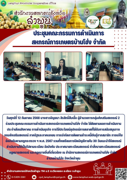 วันที่ 12 กันยายน 2568 นางสาวอัญชนา สิรสิทธิ์สืบเชื้อ ผู้อำนวยการกลุ่มส่งเสริมสหกรณ์ 2 ร่วมประชุมคณะกรรมการดำเนินการสหกรณ์การเกษตรบ้านโฮ่ง จำกัด ได้ติดตามผลการดำเนินงานประจำเดือนสิงหาคม การดำเนินธุรกิจ การใช้ประโยชน์อุปกรณ์การตลาดที่ได้รับการสนับสนุนจากกรมส่งเสริมสหกรณ์ ภาครัฐและภาคเอกชน การเร่งรัดการติดตามชำระหนี้เงินกู้จากสมาชิก การแก้ไขข้อบังคับตามกฎกระทรวง ฯ พ.ศ. 2567 รวมทั้งเตรียมการปิดบัญชีภายใน 30 วัน แนะนำให้สหกรณ์ดำเนินงานให้เป็นไปตามระเบียบ ข้อบังคับ ประกาศนายทะเบียนสหกรณ์ คำสั่งนายทะเบียนสหกรณ์ กฎหมายสหกรณ์ และกฎหมายอื่นที่เกี่ยวข้อง ณ สำนักงานสหกรณ์การเกษตรบ้านโฮ่ง จำกัด อำเภอบ้านโฮ่ง จังหวัดลำพูน