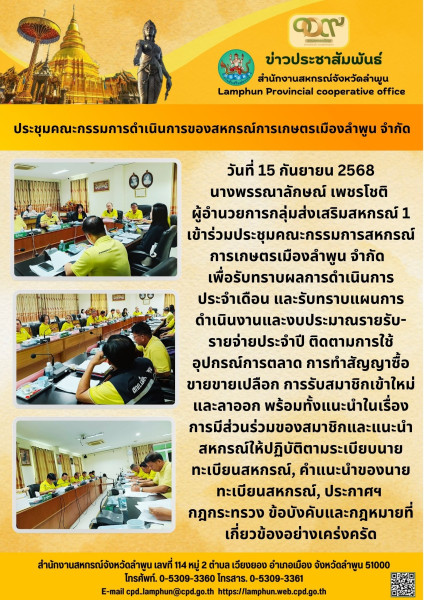 วันที่ 15 กันยายน 2568 นางพรรณาลักษณ์ เพชรโชติ ผู้อำนวยการกลุ่มส่งเสริมสหกรณ์ 1 เข้าร่วมประชุมคณะกรรมการสหกรณ์การเกษตรเมืองลำพูน จำกัด เพื่อรับทราบผลการดำเนินการประจำเดือน และรับทราบแผนการดำเนินงานและงบประมาณรายรับ-รายจ่ายประจำปี ติดตามการใช้อุปกรณ์การตลาด การทำสัญญาซื้อขายขายเปลือก การรับสมาชิกเข้าใหม่และลาออก พร้อมทั้งแนะนำในเรื่องการมีส่วนร่วมของสมาชิกและแนะนำสหกรณ์ให้ปฏิบัติตามระเบียบนายทะเบียนสหกรณ์, คำแนะนำของนายทะเบียนสหกรณ์, ประกาศฯ กฎกระทรวง ข้อบังคับและกฎหมายที่เกี่ยวข้องอย่างเคร่งครัด