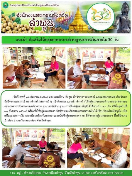 วันที่ 16 กันยายน 2568 นางแสงเดือน ต๊ะดุก นักวิชาการสหกรณ์ และนายเอกกมล เป็งวันนา นักวิชาการสหกรณ์ กลุ่มส่งเสริมสหกรณ์ 2 เข้าติดตาม แนะนำ ส่งเสริมให้กลุ่มเกษตรกรทำนาหนองล่องและกลุ่มเกษตรกรทำสวนหนองปลาสวาย สามารถจัดทำงบฐานะการเงินส่งผู้สอบบัญชีให้ได้ภายใน 30 วัน (ปีสิ้นสุดวันที่ 30 กันยายน 2568) พร้อมทั้งให้กลุ่มเกษตรกรฯ จัดทำรายละเอียดประกอบงบการเงินให้เรียบร้อยเป็นปัจจุบัน เพื่อเตรียมส่งงบการเงิน และเตรียมพร้อมรับการตรวจสอบบัญชีกลุ่มเกษตรกรฯ ณ ที่ทำการกลุ่มเกษตรกรฯ พื้นที่อำเภอบ้านโฮ่ง อำเภอเวียงหนองล่อง จังหวัดลำพูน