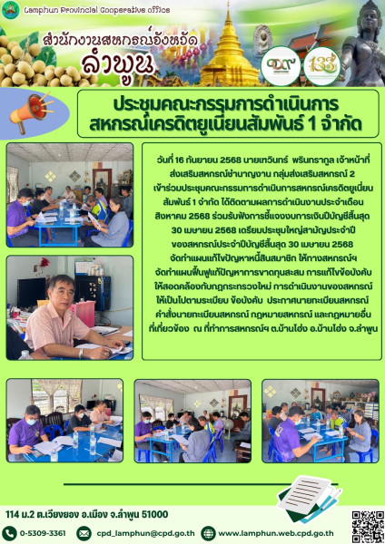 วันที่ 16 กันยายน 2568 นายเฑวินทร์ พรินทรากูล เจ้าหน้าที่ส่งเสริมสหกรณ์ชำนาญงาน กลุ่มส่งเสริมสหกรณ์ 2 เข้าร่วมประชุมคณะกรรมการดำเนินการสหกรณ์เครดิตยูเนี่ยนสัมพันธ์ 1 จำกัด ได้ติดตามผลการดำเนินงานประจำเดือนสิงหาคม 2568 ร่วมรับฟังการชี้แจงงบการเงินปีบัญชีสิ้นสุด 30 เมษายน 2568 เดรียมประชุมใหญ่สามัญประจำปีของสหกรณ์ประจำปีบัญชีสิ้นสุด 30 เมษายน 2568 จัดทำแผนแก้ไขปัญหาหนี้สินสมาชิก ให้ทางสหกรณ์ฯ จัดทำแผนฟื้นฟูแก้ปัญหาการขาดทุนสะสม การแก้ไขข้อบังคับให้สอดคล้องกับกฎกระทรวงใหม่ การดำเนินงานของสหกรณ์ให้เป็นไปตามระเบียบ ข้อบังคับ ประกาศนายทะเบียนสหกรณ์ คำสั่งนายทะเบียนสหกรณ์ กฎหมายสหกรณ์ และกฎหมายอื่นที่เกี่ยวข้อง ณ ที่ทำการสหกรณ์ฯ ต.บ้านโฮ่ง อ.บ้านโฮ่ง จ.ลำพูน