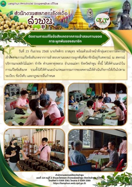 วันที่ 23 กันยายน 2568 นายกิตติกร ยาสมุทร พร้อมด้วยเจ้าหน้าที่กลุ่มตรวจการสหกรณ์ เข้าติดตามการแก้ไขข้อสังเกตจากการเข้าสอบทานยอดภาระผูกพันที่สมาชิกมีอยู่กับสหกรณ์ ณ สหกรณ์บริการแกะสลักไม้แม่ทา จำกัด ตำบลทาทุ่งหลวง อำเภอแม่ทา จังหวัดลำพูน ทั้งนี้ ได้ให้คำแนะนำในการแก้ไขข้อสังเกต รวมทั้งได้ให้คำแนะนำแก่คณะกรรมการของสหกรณ์ให้ดำเนินกิจการให้เป็นไปตาม ระเบียบ ข้อบังคับ และกฎหมายอื่นกำหนด
