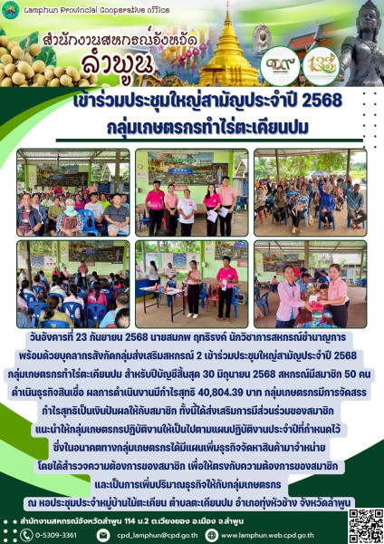 วันที่ 23 กันยายน 2568 นายสมภพ ฤทธิรงค์ นักวิชาการสหกรณ์ชำนาญการ พร้อมด้วยบุคลากรสังกัดกลุ่มส่งเสริมสหกรณ์ 2 เข้าร่วมประชุมใหญ่สามัญประจำปี 2568 กลุ่มเกษตรกรทำไร่ตะเคียนปม สำหรับปีบัญชีสิ้นสุด 30 มิถุนายน 2568 สหกรณ์มีสมาชิก 50 คน ดำเนินธุรกิจสินเชื่อ ผลการดำเนินงานมีกำไรสุทธิ 40,804.39 บาท กลุ่มเกษตรกรมีการจัดสรรกำไรสุทธิเป็นเงินปันผลให้กับสมาชิก ทั้งนี้ได้ส่งเสริมการมีส่วนร่วมของสมาชิก แนะนำให้กลุ่มเกษตรกรปฏิบัติงานให้เป็นไปตามแผนปฏิบัติงานประจำปีที่กำหนดไว้ ซึ่งในอนาคตทางกลุ่มเกษตรกรได้มีแผนเพิ่มธุรกิจจัดหาสินค้ามาจำหน่ายโดยได้สำรวจความต้องการของสมาชิก เพื่อให้ตรงกับความต้องการของสมาชิก และเป็นการเพิ่มปริมาณธุรกิจให้กับกลุ่มเกษตรกร ณ หอประชุมประจำหมู่บ้านไม้ตะเคียน ตำบลตะเคียนปม อำเภอทุ่งหัวช้าง จังหวัดลำพูน