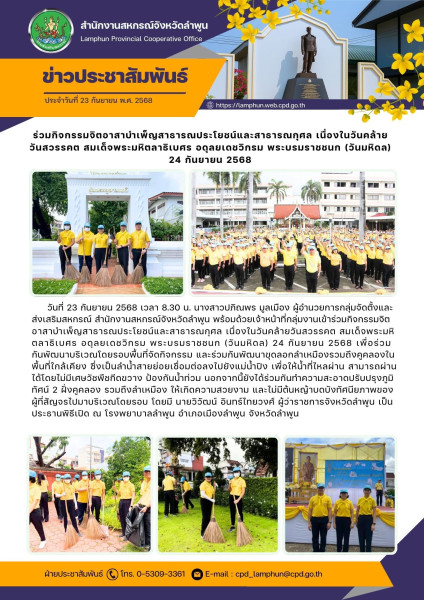 วันที่ 23 กันยายน 2568 เวลา 8.30 น. นางสาวปภิณพร มูลเมือง ผู้อำนวยการกลุ่มจัดตั้งและส่งเสริมสหกรณ์ สำนักงานสหกรณ์จังหวัดลำพูน พร้อมด้วยเจ้าหน้าที่กลุ่มงานเข้าร่วมกิจกรรมจิตอาสาบำเพ็ญสาธารณประโยชน์และสาธารณกุศล เนื่องในวันคล้ายวันสวรรคต สมเด็จพระมหิตลาธิเบศร อดุลยเดชวิกรม พระบรมราชชนก (วันมหิดล) 24 กันยายน 2568 เพื่อร่วมกันพัฒนาบริเวณโดยรอบพื้นที่จัดกิจกรรม และร่วมกันพัฒนาขุดลอกลำเหมืองรวมถึงคูคลองในพื้นที่ใกล้เคียง ซึ่งเป็นลำน้ำสายย่อยเชื่อมต่อลงไปยังแม่น้ำปิง เพื่อให้น้ำที่ไหลผ่าน สามารถผ่านได้โดยไม่มีเศษวัชพืชกีดขวาง ป้องกันน้ำท่วม นอกจากนี้ยังได้ร่วมกันทำความสะอาดปรับปรุงภูมิทัศน์ 2 ฝั่งคูคลอง รวมถึงลำเหมือง ให้เกิดความสวยงาม และไม่มีต้นหญ้าบดบังทัศนียภาพของผู้ที่สัญจรไปมาบริเวณโดยรอบ โดยมี นายวิวัฒน์ อินทร์ไทยวงศ์ ผู้ว่าราชการจังหวัดลำพูน เป็นประธานพิธีเปิด ณ โรงพยาบาลลำพูน อำเภอเมืองลำพูน จังหวัดลำพูน