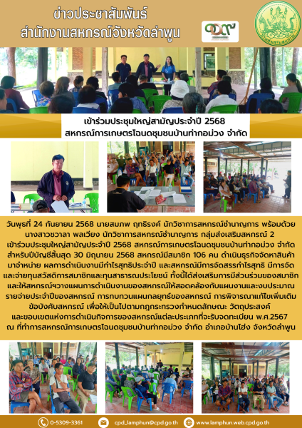 วันที่ 24 กันยายน 2568 นายสมภพ ฤทธิรงค์ นักวิชาการสหกรณ์ชำนาญการ พร้อมด้วยนางสาวชวาลา พลเวียง นักวิชาการสหกรณ์ชำนาญการ กลุ่มส่งเสริมสหกรณ์ 2 เข้าร่วมประชุมใหญ่สามัญประจำปี 2568 สหกรณ์การเกษตรโฉนดชุมชนบ้านท่ากอม่วง จำกัด สำหรับปีบัญชีสิ้นสุด 30 มิถุนายน 2568 สหกรณ์มีสมาชิก 106 คน ดำเนินธุรกิจจัดหาสินค้ามาจำหน่าย ผลการดำเนินงานมีกำไรสุทธิประจำปี และสหกรณ์มีการจัดสรรกำไรสุทธิ มีการจัดและจ่ายทุนสวัสดิการสมาชิกและทุนสาธารณประโยชน์ ทั้งนี้ได้ส่งเสริมการมีส่วนร่วมของสมาชิก และให้สหกรณ์ฯวางแผนการดำเนินงานของสหกรณ์ให้สอดคล้องกับแผนงานและงบประมาณรายจ่ายประจำปีของสหกรณ์ การทบทวนแผนกลยุทธ์ของสหกรณ์ การพิจารณาแก้ไขเพิ่มเติมข้อบังคับสหกรณ์ เพื่อให้เป็นไปตามกฎกระทรวงกำหนดลักษณะ วัตถุประสงค์ และขอบเขตแห่งการดำเนินกิจการของสหกรณ์แต่ละประเภทที่จะรับจดทะเบียน พ.ศ.2567 ณ ที่ทำการสหกรณ์การเกษตรโฉนดชุมชนบ้านท่ากอม่วง จำกัด อำเภอบ้านโฮ่ง จังหวัดลำพูน