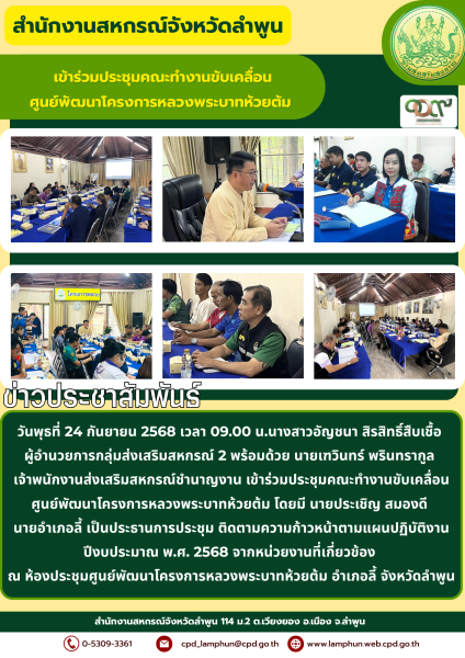วันที่ 24 กันยายน 2568 เวลา 09.00 น.นางสาวอัญชนา สิรสิทธิ์สืบเชื้อ ผู้อำนวยการกลุ่มส่งเสริมสหกรณ์ 2 พร้อมด้วย นายเฑวินทร์ พรินทรากูล เจ้าพนักงานส่งเสริมสหกรณ์ชำนาญงาน เข้าร่วมประชุมคณะทำงานขับเคลื่อนศูนย์พัฒนาโครงการหลวงพระบาทห้วยต้ม โดยมี นายประเชิญ สมองดี นายอำเภอลี้ เป็นประธานการประชุม ติดตามความก้าวหน้าตามแผนปฏิบัติงาน ปีงบประมาณ พ.ศ. 2568 จากหน่วยงานที่เกี่ยวข้อง ณ ห้องประชุมศูนย์พัฒนาโครงการหลวงพระบาทห้วยต้ม อำเภอลี้ จังหวัดลำพูน