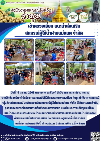 วันที่ 15 ตุลาคม 2568 นายสมภพ ฤทธิรงค์ นักวิชาการสหกรณ์ชำนาญการ กลุ่มส่งเสริมสหกรณ์ 2 เข้าร่วมประชุมคณะกรรมการดำเนินการสหกรณ์เครดิตยูเนี่ยนบ้านปูพัฒนา จำกัด แนะนำ ส่งเสริม เรื่องการพัฒนาระบบการควบคุมภายในของสหกรณ์ตามคำแนะนำของผู้สอบบัญชี พิจารณาแก้ไขระเบียบของสหกรณ์ ทบทวนแผนกลยุทธ์ของสหกรณ์ รวมทั้งได้ให้คำแนะนำในการดำเนินงานต่างๆ ให้เป็นไปตามระเบียบ ข้อบังคับ กฎหมายสหกรณ์ และกฎหมายอื่นที่เกี่ยวข้อง ณ ที่ทำการสหกรณ์เครดิตยูเนี่ยนบ้านปูพัฒนา จำกัด อำเภอลี้ จังหวัดลำพูน