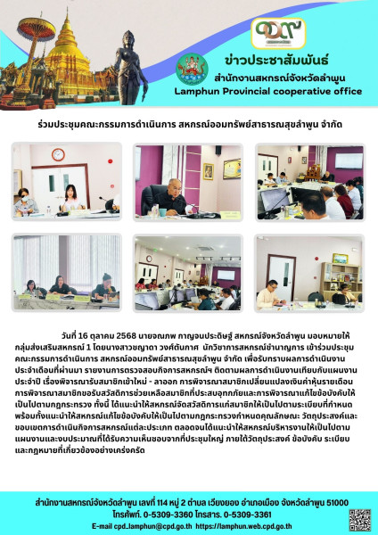 วันที่ 16 ตุลาคม 2568 นายจณภพ กาญจนประดิษฐ์ สหกรณ์จังหวัดลำพูน มอบหมายให้ กลุ่มส่งเสริมสหกรณ์ 1 โดยนางสาวชญาดา วงศ์ตันกาศ นักวิชาการสหกรณ์ชำนาญการ เข้าร่วมประชุมคณะกรรมการดำเนินการ สหกรณ์ออมทรัพย์สาธารณสุขลำพูน จำกัด เพื่อรับทราบผลการดำเนินงานประจำเดือนที่ผ่านมา รายงานการตรวจสอบกิจการสหกรณ์ฯ ติดตามผลการดำเนินงานเทียบกับแผนงานประจำปี เรื่องพิจารณารับสมาชิกเข้าใหม่ - ลาออก การพิจารณาสมาชิกเปลี่ยนแปลงเงินค่าหุ้นรายเดือน การพิจารณาสมาชิกขอรับสวัสดิการช่วยเหลือสมาชิกที่ประสบอุทกภัยและการพิจารณาแก้ไขข้อบังคับให้เป็นไปตามกฎกระทรวง ทั้งนี้ ได้แนะนำให้สหกรณ์จัดสวัสดิการแก่สมาชิกให้เป็นไปตามระเบียบที่กำหนด พร้อมทั้งแนะนำให้สหกรณ์แก้ไขข้อบังคับให้เป็นไปตามกฎกระทรวงกำหนดคุณลักษณะ วัตถุประสงค์และขอบเขตการดำเนินกิจการสหกรณ์แต่ละประเภท ตลอดจนได้แนะนำให้สหกรณ์บริหารงานให้เป็นไปตามแผนงานและงบประมาณที่ได้รับความเห็นชอบจากที่ประชุมใหญ่ ภายใต้วัตถุประสงค์ ข้อบังคับ ระเบียบ และกฎหมายที่เกี่ยวข้องอย่างเคร่งครัด