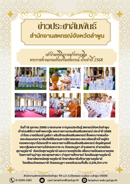 วันที่ 18 ตุลาคม 2568 นายจณภพ กาญจนประดิษฐ์ สหกรณ์จังหวัดลำพูน เข้าร่วมพิธีถวายผ้าพระกฐิน พระราชทานกรมส่งเสริมสหกรณ์ ประจำปี 2568 นำโดย นายนิรันดร์ มูลธิดา อธิบดีกรมส่งเสริมสหกรณ์ ซึ่งพระบาทสมเด็จพระปรเมนทรรามาธิบดีศรีสินทรมหาวชิราลงกรณ พระวชิรเกล้าเจ้าอยู่หัว ทรงพระกรุณาโปรดเกล้าฯ พระราชทานให้กรมส่งเสริมสหกรณ์ อัญเชิญองค์พระกฐินพระราชทานไปทอดถวาย ณ วัดธรรมบูชา ตำบลตลาด อำเภอเมืองสุราษฎร์ธานี จังหวัดสุราษฎร์ธานี และถวายจตุปัจจัย เพื่อถวายเป็นพระราชกุศล โดยการทำนุบำรุง พระพุทธศาสนา บำรุงการศึกษาแก่ โรงเรียนสุราษฎร์ธานี วิทยาลัยเทคนิคสุราษฎร์ธานี วิทยาลัยอาชีวศึกษาสุราษฎร์ธานี โรงเรียนวัดธรรมบาลี วัดธรรมบูชา ยอดเงินรวมทั้งสิ้น 2,216,314 บาท