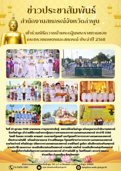 วันที่ 19 ตุลาคม 2568 นายจณภพ กาญจนาประดิษฐ์ สหกรณ์จังหวัดลำพูน พร้อมบุคลากรสำนักงานสหกรณ์จังหวัดลำพูน เข้าร่วมพิธีถวายผ้าพระกฐินพระราชทานของกระทรวงเกษตรและสหกรณ์ ประจำปี 2568 โดยมี ร้อยเอก ธรรมนัส พรหมเผ่า รองนายกรัฐมนตรี และรัฐมนตรีว่าการกระทรวงเกษตรและสหกรณ์ เป็นประธานในพิธี พร้อมด้วยนายนเรศ ธำรงค์ทิพยคุณ รัฐมนตรีช่วยว่าการกระทรวงเกษตรและสหกรณ์ นายวิณะโรจน์ ทรัพย์ส่งสุข ปลัดกระทรวงเกษตรและสหกรณ์ นายนิรันดร์ มูลธิดา อธิบดีกรมส่งเสริมสหกรณ์ นายประวัติ แดงบรรจง รองอธิบดีกรมส่งเสริมสหกรณ์ นายมนัส เทพรักษ์ รองอธิบดีกรมส่งเสริมสหกรณ์ และผู้บริหารในสังกัดกระทรวงเกษตรและสหกรณ์ เข้าร่วมในพิธี ณ วัดศรีโคมคำ พระอารามหลวง ตำบลเวียง อำเภอเมือง จังหวัดพะเยา