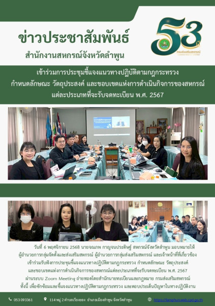 วันที่ 6 พฤศจิกายน 2568 นายจณภพ กาญจนประดิษฐ์ สหกรณ์จังหวัดลำพูน มอบหมายให้ ผู้อำนวยการกลุ่มจัดตั้งและส่งเสริมสหกรณ์ ผู้อำนวยการกลุ่มส่งเสริมสหกรณ์ และเจ้าหน้าที่ที่เกี่ยวข้อง เข้าร่วมรับฟังการประชุมชี้แจงแนวทางปฏิบัติตามกฎกระทรวง กำหนดลักษณะ วัตถุประสงค์ และขอบเขตแห่งการดำเนินกิจการของสหกรณ์แต่ละประเภทที่จะรับจดทะเบียน พ.ศ. 2567 ผ่านระบบ Zoom Meeting ถ่ายทอดโดยสำนักนายทะเบียนและกฎหมาย กรมส่งเสริมสหกรณ์ ทั้งนี้ เพื่อซักซ้อมและชี้แจงแนวทางปฏิบัติตามกฎกระทรวง และตอบประเด็นปัญหาในทางปฏิบัติงาน