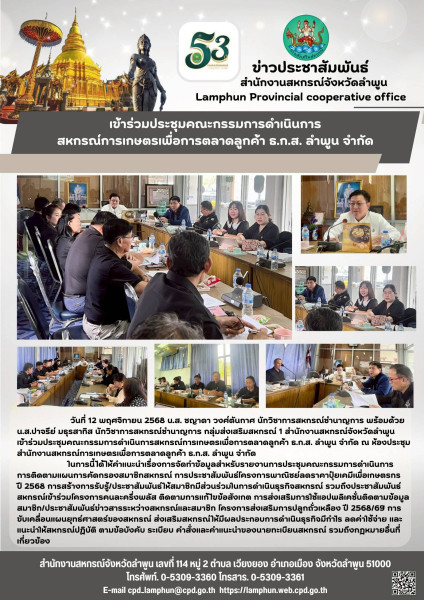 วันที่ 12 พฤศจิกายน 2568 น.ส. ชญาดา วงศ์ตันกาศ นักวิชาการสหกรณ์ชำนาญการ พร้อมด้วย น.ส.ปาจรีย์ มธุรสาทิส นักวิชาการสหกรณ์ชำนาญการ กลุ่มส่งเสริมสหกรณ์ 1 สำนักงานสหกรณ์จังหวัดลำพูน เข้าร่วมประชุมคณะกรรมการดำเนินการสหกรณ์การเกษตรเพื่อการตลาดลูกค้า ธ.ก.ส. ลำพูน จำกัด ณ ห้องประชุมสำนักงานสหกรณ์การเกษตรเพื่อการตลาดลูกค้า ธ.ก.ส. ลำพูน จำกัด ในการนี้ได้ให้คำแนะนำเรื่องการจัดทำข้อมูลสำหรับรายงานการประชุมคณะกรรมการดำเนินการติดตามแผนการคัดกรองสมาชิกสหกรณ์ การประชาสัมพันธ์โครงการพาณิชย์ลดราคาปุ๋ยเคมีเพื่อเกษตรกร ปี 2568 การสร้างการรับรู้/ประชาสัมพันธ์ให้สมาชิกมีส่วนร่วมในการดำเนินธุรกิจสหกรณ์ รวมถึงประชาสัมพันธ์สหกรณ์เข้าร่วมโครงการคนละครึ่งพลัส ติดตามการแก้ไขข้อสังเกต การส่งเสริมการใช้แอปพลิเคชั่นติดตามข้อมูลสมาชิก/ประชาสัมพันธ์ข่าวสารระหว่างสหกรณ์และสมาชิก โครงการส่งเสริมการปลูกถั่วเหลือง ปี 2568/69 การขับเคลื่อนแผนยุทธ์ศาสตร์ของสหกรณ์ ส่งเสริมสหกรณ์ให้มีผลประกอบการดำเนินธุรกิจมีกำไร ลดค่าใช้จ่าย และแนะนำให้สหกรณ์ปฏิบัติ ตามข้อบังคับ ระเบียบ คำสั่งและคำแนะนำของนายทะเบียนสหกรณ์ รวมถึงกฎหมายอื่นที่เกี่ยวข้อง