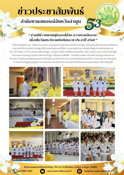 วันที่ 14 พฤศจิกายน 2568 นายจนภพ กาญจนประดิษฐ์ สหกรณ์จังหวัดลำพูน พร้อมด้วยข้าราชการและพนักงานราชการสำนักงานจังหวัดลำพูน พิธีวางพานพุ่มดอกไม้สด ถวายราชสักการะ เนื่องในวันพระบิดาแห่งฝนหลวง ประจำปี 2568 ณ ที่ว่าการอำเภอเมืองลำพูน จ.ลำพูน โดยมี นายโยธิน ประสงค์ความดี รองผู้ว่าราชการจังหวัดลำพูน รักษาราชการแทนผู้ว่าราชการจังหวัดลำพูน เป็นประธานในพิธี นายปรีชา สมชัย ปลัดจังหวัดลำพูน พร้อมด้วยข้าราชการ ผู้บริหารองค์ปกครองส่วนท้องถิ่น สมาชิกเหล่ากาชาค สมาชิกแม่บ้านมหาดไทย ภาคเอกชน และพสกนิกรชาวจังหวัดลำพูนทุกหมู่เหล่า ร่วมแสดงความจงรักภักดี และน้อมรำลึกในพระมหากรุณาธิคุณ อันหาที่สุดมิได้