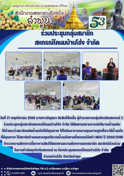 วันที่ 21 พฤศจิกายน 2568 นางสาวอัญชนา สิรสิทธิ์สืบเชื้อ ผู้อำนวยการกลุ่มส่งเสริมสหกรณ์ 2 ร่วมประชุมกลุ่มสมาชิกสหกรณ์โคนมบ้านโฮ่ง จำกัด ได้ติดตามสถานการณ์ปริมาณน้ำนมดิบ ให้คำแนะนำสมาชิกผลิตน้ำนมโคให้มีคุณภาพ ให้โคกินอาหารหยาบคุณภาพสูงเพื่อจะได้น้ำนมโคที่มีคุณภาพ ให้สมาชิกทำแผนควบคุมปริมาณน้ำนมโคตามที่สหกรณ์จัดทำ MOU ปี 2568/2569 สำรวจความต้องการซื้ออาหารสัตว์ให้ตรงตามความต้องการของสมาชิก สมาชิกมีส่วนร่วมในการดำเนินธุรกิจกับสหกรณ์ ณ ห้องประชุมสหกรณ์โคนมบ้านโฮ่ง จำกัด อำเภอบ้านโฮ่ง จังหวัดลำพูน