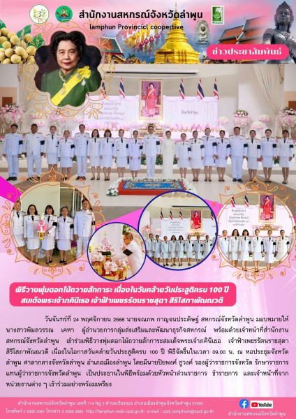 วันที่ 24 พฤศจิกายน 2568 นายจณภพ กาญจนประดิษฐ์ สหกรณ์จังหวัดลำพูน มอบหมายให้นางสาวพิมลวรรณ เคหา ผู้อำนวยการกลุ่มส่งเสริมและพัฒนาธุรกิจสหกรณ์ พร้อมด้วยเจ้าหน้าที่สำนักงานสหกรณ์จังหวัดลำพูน เข้าร่วมพิธีวางพุ่มดอกไม้ถวายสักการะสมเด็จพระเจ้าภคินีเธอ เจ้าฟ้าเพชรรัตนราชสุดาสิริโสภาพัณณวดี เนื่องในโอกาสวันคล้ายวันประสูติครบ 100 ปี พิธีจัดขึ้นในเวลา 09.00 น. ณ หอประชุมจังหวัดลำพูน ศาลากลางจังหวัดลำพูน อำเภอเมืองลำพูน โดยมีนายปิยพงศ์ ชูวงศ์ รองผู้ว่าราชการจังหวัด รักษาราชการแทนผู้ว่าราชการจังหวัดลำพูน เป็นประธานในพิธีพร้อมด้วยหัวหน้าส่วนราชการ ข้าราชการ และเจ้าหน้าที่จากหน่วยงานต่าง ๆ เข้าร่วมอย่างพร้อมเพรียง