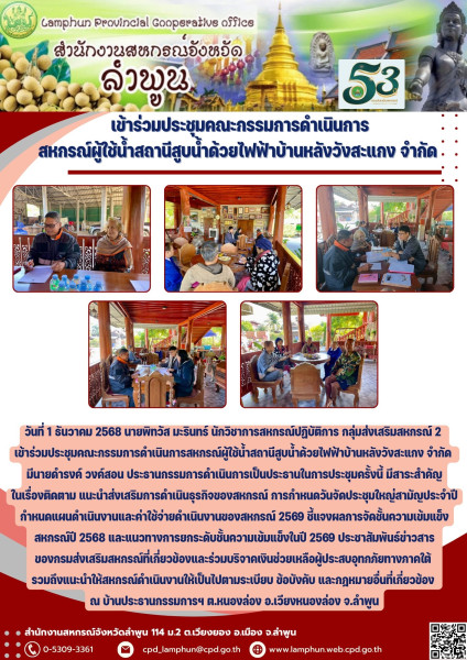 วันที่ 1 ธันวาคม 2568 นายพิทวัส มะรินทร์ นักวิชาการสหกรณ์ปฏิบัติการ กลุ่มส่งเสริมสหกรณ์ 2 เข้าร่วมประชุมคณะกรรมการดำเนินการสหกรณ์ผู้ใช้น้ำสถานีสูบน้ำด้วยไฟฟ้าบ้านหลังวังสะแกง จำกัด มีนายดำรงค์ วงค์สอน ประธานกรรมการดำเนินการเป็นประธานในการประชุมครั้งนี้ มีสาระสำคัญในเรื่องติดตาม แนะนำส่งเสริมการดำเนินธุรกิจของสหกรณ์ การกำหนดวันจัดประชุมใหญ่สามัญประจำปี กำหนดแผนดำเนินงานและค่าใช้จ่ายดำเนินงานของสหกรณ์ 2569 ชี้แจงผลการจัดชั้นความเข้มแข็งสหกรณ์ปี 2568 และแนวทางการยกระดับชั้นความเข้มแข็งในปี 2569 ประชาสัมพันธ์ข่าวสารของกรมส่งเสริมสหกรณ์ที่เกี่ยวข้องและร่วมบริจาคเงินช่วยเหลือผู้ประสบอุทกภัยทางภาคใต้ รวมถึงแนะนำให้สหกรณ์ดำเนินงานให้เป็นไปตามระเบียบ ข้อบังคับ และกฎหมายอื่นที่เกี่ยวข้อง ณ บ้านประธานกรรมการฯ ต.หนองล่อง อ.เวียงหนองล่อง จ.ลำพูน
