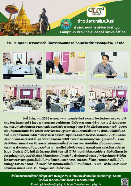 วันที่ 5 ธันวาคม 2568 นายจณภพ กาญจนประดิษฐ์ สหกรณ์จังหวัดลำพูน มอบหมายให้ กลุ่มส่งเสริมสหกรณ์ 1 โดยนางสาวชญาดา วงศ์ตันกาศ นักวิชาการสหกรณ์ชำนาญการ เข้าร่วมประชุมคณะกรรมการดำเนินการของสหกรณ์ออมทรัพย์สาธารณสุขลำพูน จำกัด เพื่อรับทราบผลการดำเนินงานเทียบกับแผนงานประจำปี การพิจารณารับรองงบฐานะการเงินและงบกำไรขาดทุน สำหรับปีบัญชีสิ้นสุดวันที่ 30 พฤศจิกายน 2568 การพิจารณาจัดสรรกำไรสุทธิประจำปี การพิจารณากำหนดแผนงานและงบประมาณรายจ่ายประจำปี สิ้นสุด 30 พฤศจิกายน 2569 การพิจารณากำหนดวงเงินกู้ยืมหรือค้ำประกันประจำปีของสหกรณ์ การพิจารณาการกำหนดค่าเบี้ยเลี้ยง ค่าพาหนะ ค่าเช่าที่พัก เบี้ยประชุมของคณะกรรมการ ค่าตอบแทนผู้ตรวจสอบกิจการ การแก้ไขข้อบังคับสหกรณ์ และเตรียมการสำหรับการประชุมใหญ่สามัญประจำปีในวันที่ 13 ธันวาคม 2568 ในการนี้ ได้ให้คำแนะนำ ให้สหกรณ์ประชาสัมพันธ์ในการจัดประชุมใหญ่สามัญประจำปี 2568 ให้สมาชิกทราบโดยทั่วกัน ดำเนินการจัดประชุมใหญ่สามัญประจำปีเป็นไปตามวาระการประชุมและให้เป็นไปตามข้อบังคับของสหกรณ์ และการแก้ไขข้อบังคับสหกรณ์ให้เป็นไปตามกฎกระทรวง ตลอดจนได้แนะนำให้การดำเนินงานให้เป็นไปตามข้อบังคับ ระเบียบ คำสั่ง และคำแนะนำของนายทะเบียนสหกรณ์รวมถึงกฎหมายอื่นที่เกี่ยวข้อง