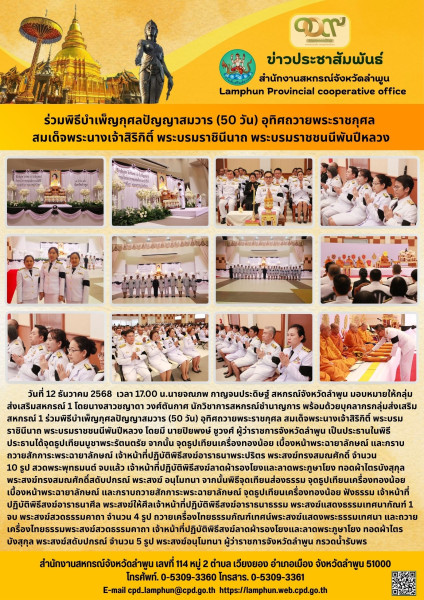 วันที่ 12 ธันวาคม 2568 เวลา 17.00 น.นายจณภพ กาญจนประดิษฐ์ สหกรณ์จังหวัดลำพูน มอบหมายให้กลุ่มส่งเสริมสหกรณ์ 1 โดยนางสาวชญาดา วงศ์ตันกาศ นักวิชาการสหกรณ์ชำนาญการ พร้อมด้วยบุคลากรกลุ่มส่งเสริมสหกรณ์ 1 ร่วมพิธีบำเพ็ญกุศลปัญญาสมวาร (50 วัน) อุทิศถวายพระราชกุศล สมเด็จพระนางเจ้าสิริกิติ์ พระบรมราชินีนาถ พระบรมราชชนนีพันปีหลวง โดยมี นายปิยพงษ์ ชูวงศ์ ผู้ว่าราชการจังหวัดลำพูน เป็นประธานในพิธี ประธานได้จุดธูปเทียนบูชาพระรัตนตรัย จากนั้น จุดธูปเทียนเครื่องทองน้อย เบื้องหน้าพระฉายาลักษณ์ และกราบถวายสักการะพระฉายาลักษณ์ เจ้าหน้าที่ปฏิบัติพิธีสงฆ์อาราธนาพระปริตร พระสงฆ์ทรงสมณศักดิ์ จำนวน 10 รูป สวดพระพุทธมนต์ จบแล้ว เจ้าหน้าที่ปฏิบัติพิธีสงฆ์ลาดผ้ารองโยงและลาดพระภูษาโยง ทอดผ้าไตรบังสุกุล พระสงฆ์ทรงสมณศักดิ์สดับปกรณ์ พระสงฆ์ อนุโมทนา จากนั้นพิธีจุดเทียนส่องธรรม จุดธูปเทียนเครื่องทองน้อย เบื้องหน้าพระฉายาลักษณ์ และกราบถวายสักการะพระฉายาลักษณ์ จุดธูปเทียนเครื่องทองน้อย ฟังธรรม เจ้าหน้าที่ปฏิบัติพิธีสงฆ์อาราธนาศีล พระสงฆ์ให้ศีลเจ้าหน้าที่ปฏิบัติพิธีสงฆ์อาราธนาธรรม พระสงฆ์แสดงธรรมเทศนากัณฑ์ 1 จบ พระสงฆ์สวดธรรมคาถา จำนวน 4 รูป ถวายเครื่องไทยธรรมกัณฑ์เทศน์พระสงฆ์แสดงพระธรรมเทศนา และถวายเครื่องไทยธรรมพระสงฆ์สวดธรรมคาถา เจ้าหน้าที่ปฏิบัติพิธีสงฆ์ลาดผ้ารองโยงและลาดพระภูษาโยง ทอดผ้าไตรบังสุกุล พระสงฆ์สดับปกรณ์ จำนวน 5 รูป พระสงฆ์อนุโมทนา ผู้ว่าราชการจังหวัดลำพูน กรวดน้ำรับพร