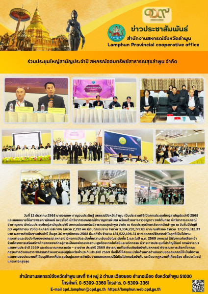 วันที่ 13 ธันวาคม 2568 นายจณภพ กาญจนประดิษฐ์ สหกรณ์จังหวัดลำพูน เป็นประธานพิธีเปิดการประชุมใหญ่สามัญประจำปี 2568และมอบหมายให้นางพรรณาลักษณ์ เพชรโชติ นักวิชาการสหกรณ์ชำนาญการพิเศษ พร้อมด้วยนางสาวชญาดา วงศ์ตันกาศ นักวิชาการสหกรณ์ชำนาญการ เข้าร่วมประชุมใหญ่สามัญประจำปี สหกรณ์ออมทรัพย์สาธารณสุขลำพูน จำกัด ณ ห้องประชุมวิทยาลัยเทคนิคลำพูน ณ วันสิ้นปีบัญชี 30 พฤศจิกายน 2568 สหกรณ์ มีสมาชิก จำนวน 2,793 คน มีทุนดำเนินงาน จำนวน 3,334,232,772.65 บาท ทุนสำรอง จำนวน 177,278,312.33 บาท ผลการดำเนินงานประจำปี สิ้นสุด 30 พฤศจิกายน 2568 มีผลกำไร จำนวน 124,522,196.31 บาท สหกรณ์จัดสรรกำไรสุทธิเป็นไปตามกฎหมายและข้อบังคับของสหกรณ์ สหกรณ์ มีผลการจัดระดับชั้นความเข้มแข็งในระดับชั้น 1 และในปี พ.ศ. 2569 สหกรณ์ ได้รับการคัดเลือกเข้าร่วมโครงการเสริมสร้างศักยภาพองค์กรสู่การเป็นองค์กรสมรรถนะสูงด้วยเทคโนโลยีและนวัตกรรม มีวาระการประชุมที่สำคัญได้แก่ การพิจารณาแผนงานประจำปี 2569 และประมาณการรายรับ – รายจ่าย ประจำปี 2569 พิจารณาแก้ไขเพิ่มเติมข้อบังคับสหกรณ์ พิจารณาการเลือกตั้งคณะกรรมการดำเนินการ พิจารณากำหนดวงเงินกู้ยืมหรือค้ำประกันประจำปี 2569 ทั้งนี้ได้ให้คำแนะนำในด้านการดำเนินงานของสหกรณ์ให้เป็นไปตามแผนงานงบประมาณที่ได้อนุมัติจากที่ประชุมใหญ่และการดำเนินงานของสหกรณ์ให้เป็นไปตามข้อบังคับ ระเบียบ กฎหมายที่เกี่ยวข้อง เพื่อประโยชน์แก่สมาชิกสูงสุด