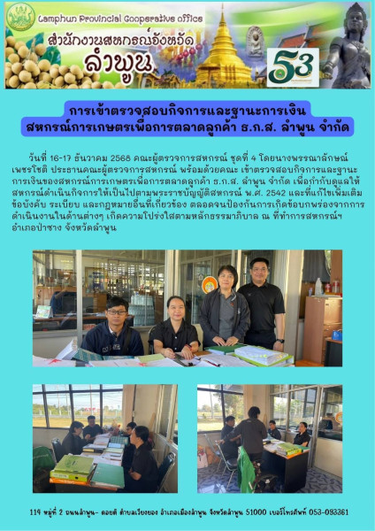 วันที่ 16-17 ธันวาคม 2568 คณะผู้ตรวจการสหกรณ์ ชุดที่ 4 โดยนางพรรณาลักษณ์ เพชรโชติ ประธานคณะผู้ตรวจการสหกรณ์ พร้อมด้วยคณะ เข้าตรวจสอบกิจการและฐานะการเงินของสหกรณ์การเกษตรเพื่อการตลาดลูกค้า ธ.ก.ส. ลำพูน จำกัด เพื่อกำกับดูแลให้สหกรณ์ดำเนินกิจการให้เป็นไปตามพระราชบัญญัติสหกรณ์ พ.ศ. 2542 และที่แก้ไขเพิ่มเติม ข้อบังคับ ระเบียบ และกฎหมายอื่นที่เกี่ยวข้อง ตลอดจนป้องกันการเกิดข้อบกพร่องจากการดำเนินงานในด้านต่างๆ เกิดความโปร่งใสตามหลักธรรมาภิบาล ณ ที่ทำการสหกรณ์ฯ อำเภอป่าซาง จังหวัดลำพูน