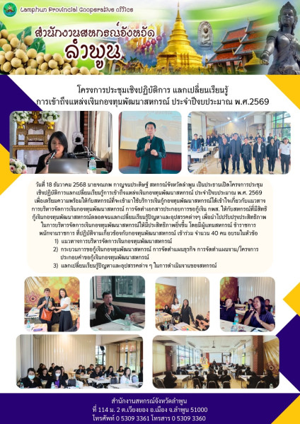 วันที่ 18 ธันวาคม 2568 นายจณภพ กาญจนประดิษฐ์ สหกรณ์จังหวัดลำพูน เป็นประธานเปิดโครงการประชุมเชิงปฏิบัติการแลกเปลี่ยนเรียนรู้การเข้าถึงแหล่งเงินกองทุนพัฒนาสหกรณ์ ประจำปีงบประมาณ พ.ศ. 2569 เพื่อเตรียมความพร้อมให้กับสหกรณ์ที่จะเข้ามาใช้บริการเงินกู้กองทุนพัฒนาสหกรณ์ได้เข้าใจเกี่ยวกับแนวทางการบริหารจัดการเงินกองทุนพัฒนาสหกรณ์ การจัดทำเอกสารประกอบการขอกู้เงิน กพส. ให้กับสหกรณ์ที่มีสิทธิกู้เงินกองทุนพัฒนาสหกรณ์ตลอดจนแลกเปลี่ยนเรียนรู้ปัญหาและอุปสรรคต่างๆ เพื่อนำไปปรับปรุงประสิทธิภาพในการบริหารจัดการเงินกองทุนพัฒนาสหกรณ์ให้มีประสิทธิภาพยิ่งขึ้น โดยมีผู้แทนสหกรณ์ ข้าราชการ พนักงานราชการ ที่ปฏิบัติงานเกี่ยวข้องกับกองทุนพัฒนาสหกรณ์ เข้าร่วม จำนวน 40 คน อบรมในหัวข้อ 1) แนวทางการบริหารจัดการเงินกองทุนพัฒนาสหกรณ์ 2) กระบวนการขอกู้เงินกองทุนพัฒนาสหกรณ์ การจัดทำแผนธุรกิจ การจัดทำแผนงาน/โครงการประกอบคำขอกู้เงินกองทุนพัฒนาสหกรณ์ 3) แลกเปลี่ยนเรียนรู้ปัญหาและอุปสรรคต่าง ๆ ในการดำเนินงานของสหกรณ์