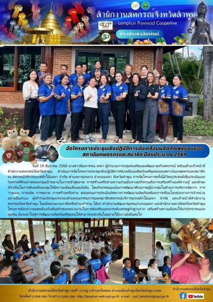 วันที่ 19 ธันวาคม 2568 นางสาวพิมลวรรณ เคหา ผู้อำนวยการกลุ่มส่งเสริมและพัฒนาธุรกิจสหกรณ์ พร้อมด้วยเจ้าหน้าที่สำนักงานสหกรณ์จังหวัดลำพูน ดำเนินการจัดโครงการประชุมเชิงปฏิบัติการขับเคลื่อนผลิตภัณฑ์ชุมชนของสถาบันเกษตรกรและสมาชิก ณ สหกรณ์บริการแกะสลักไม้แม่ทา จำกัด ตำบลทาทุ่งหลวง อำเภอแม่ทา จังหวัดลำพูน การจัดโครงการครั้งนี้มีวัตถุประสงค์เพื่อประเมินและวิเคราะห์ศักยภาพของกลุ่มเป้าหมายในการเข้าสู่ตลาด การสร้างเครือข่ายความร่วมมือทางธุรกิจรวมถึงการเสริมสร้างองค์ความรู้ และทักษะที่จำเป็นในการขับเคลื่อนกลุ่มให้มีความเข้มแข็งและยั่งยืน โดยกิจกรรมมุ่งเน้นการพัฒนาศักยภาพผู้นำกลุ่มในด้านการบริหารจัดการ การวางแผน การผลิต การตลาด การสร้างเครือข่าย ตลอดจนการประเมินทิศทางการพัฒนาผลิตภัณฑ์และการเชื่อมโยงช่องทางการจำหน่ายอย่างเป็นระบบ ผู้เข้าร่วมประชุมประกอบด้วยคณะกรรมการและสมาชิกสหกรณ์บริการแกะสลักไม้แม่ทา จำกัด และเจ้าหน้าที่สำนักงานสหกรณ์จังหวัดลำพูน โดยมีหน่วยงานภาคีเครือข่ายเข้าร่วม ได้แก่ สำนักงานพัฒนาชุมชนอำเภอแม่ทา และสำนักงานพาณิชย์จังหวัดลำพูน โครงการดังกล่าวสอดคล้องกับพันธกิจของหน่วยงานในการส่งเสริมและยกระดับเศรษฐกิจฐานราก เสริมสร้างความมั่นคงให้แก่ประชาชนและชุมชน อันจะนำไปสู่การพัฒนาผลิตภัณฑ์ชุมชนให้สามารถแข่งขันในตลาดได้อย่างยั่งยืนต่อไป